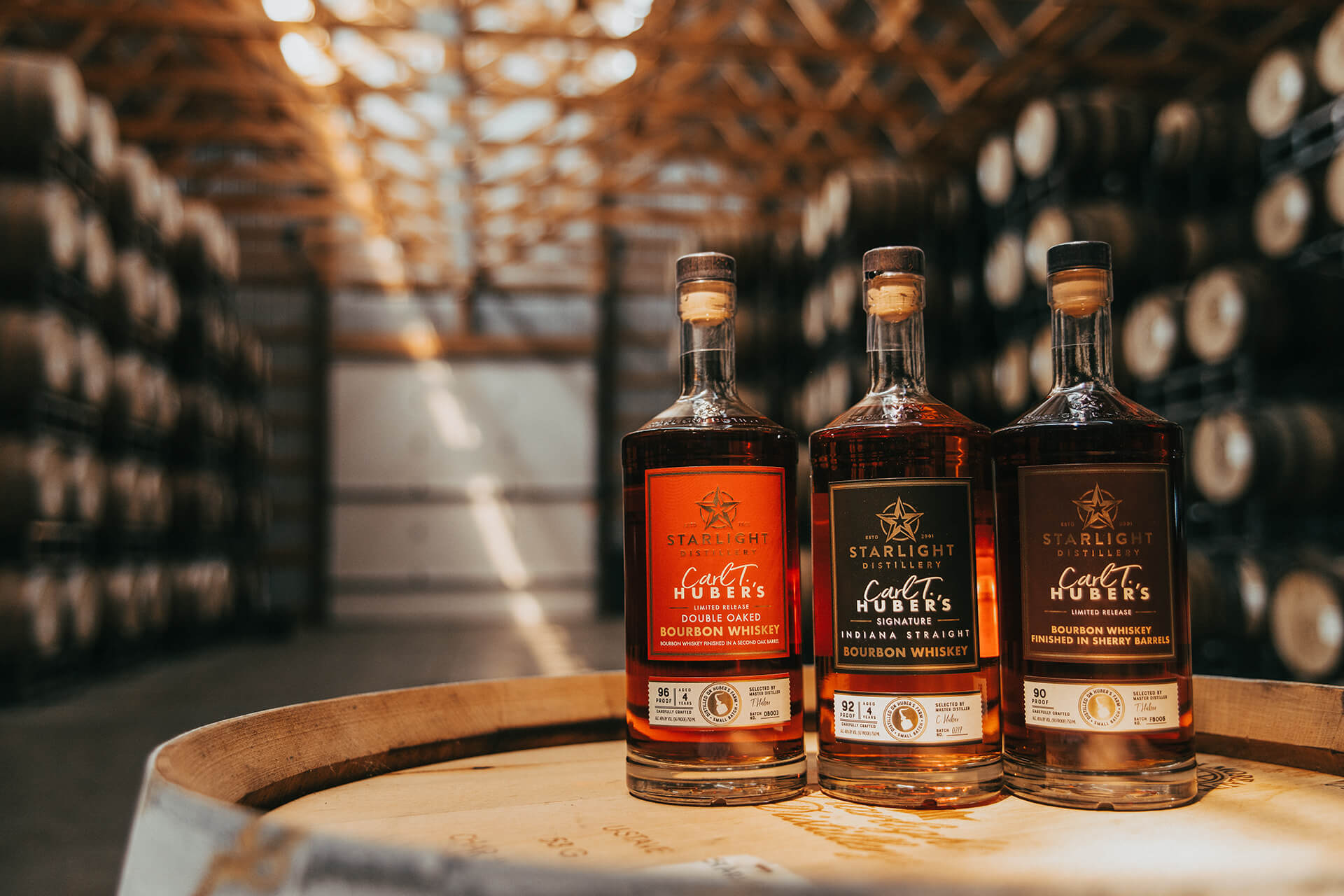 Starlight Distillery is located in Starlight, IN just 30 minutes north of Louisville, KY. Located on the property at Huber’s Orchard & Winery, Starlight produces bourbon, brandy, vodka, blackberry whiskey, and gin. Our distillers produce high-quality bourbons sold as single barrels and blended for a variety of finishing barrels which add unique complexities to our straight bourbon and rye single barrel whiskeys. With over 50 acres of heirloom corn varieties, Starlight grows, mashes, mills, distills, and bottles everything on their 700 acre property. 7 generations, 700 acres, and 179 years of history for the Huber Starlight Distillery family.